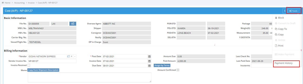 Once the payments have been made, click "Tools" > "Payment History" on the invoice entry page to review previously made payments. You can also click the Post Date hyperlink to navigate directly to the payment page.