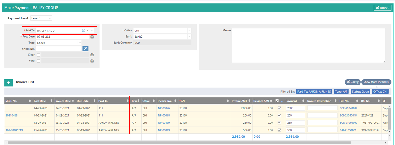 9. This payment will cover the AP invoices for both “AARON AIRLINES” and “111” accounts. You will be making the payment to BAILEY GROUP.