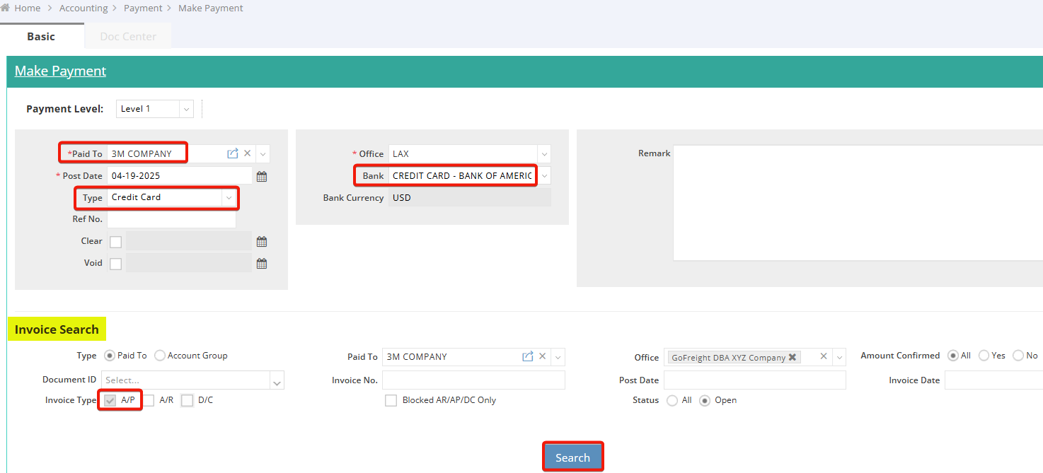 In some situations, you may need to make payments using a credit card. In GoFreight, credit cards are treated as banks within the system. You can record a payment using a credit card in GoFreight by following the steps outlined below.