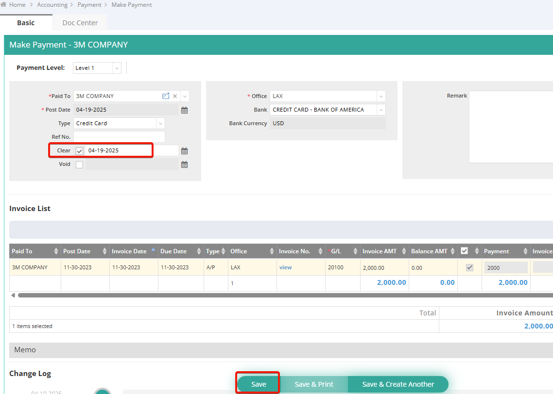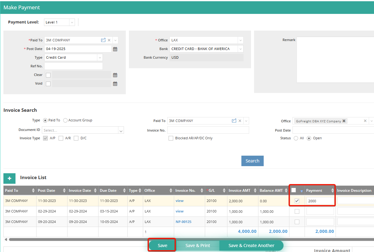 6. Check the box next to “Balance AMT” for the Invoices you would like to pay. Once it is checked, the amount will be synchronized in the field of “Payment”.