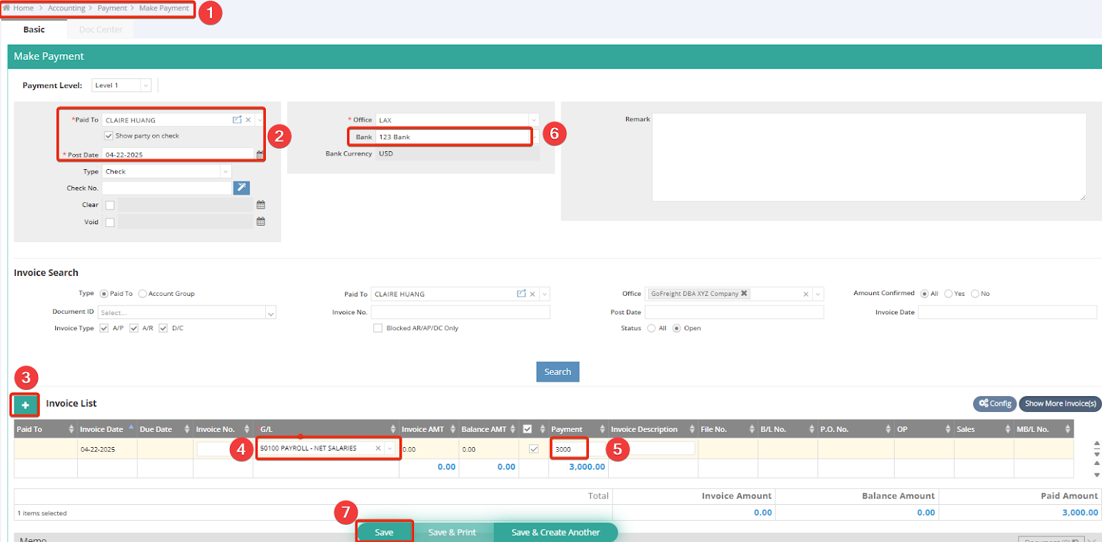 Note: In this example, we will pay employee salaries. A virtual employee named Claire Huang has been created in the Trade Partner section. This step only needs to be done once.