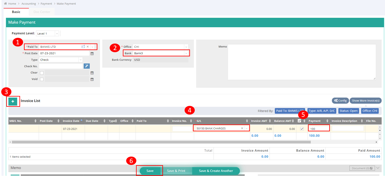 1. Select a trade partner in the “Paid to“ field for this transaction. In this example, we select Bank LTD as the bank to which we are paying the charge.