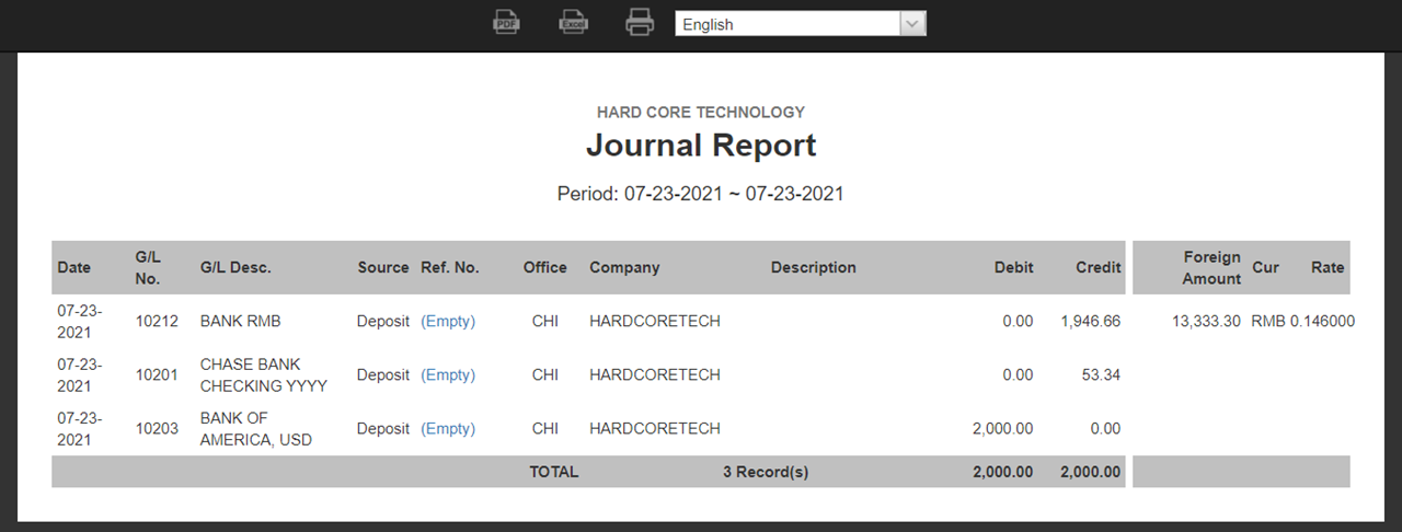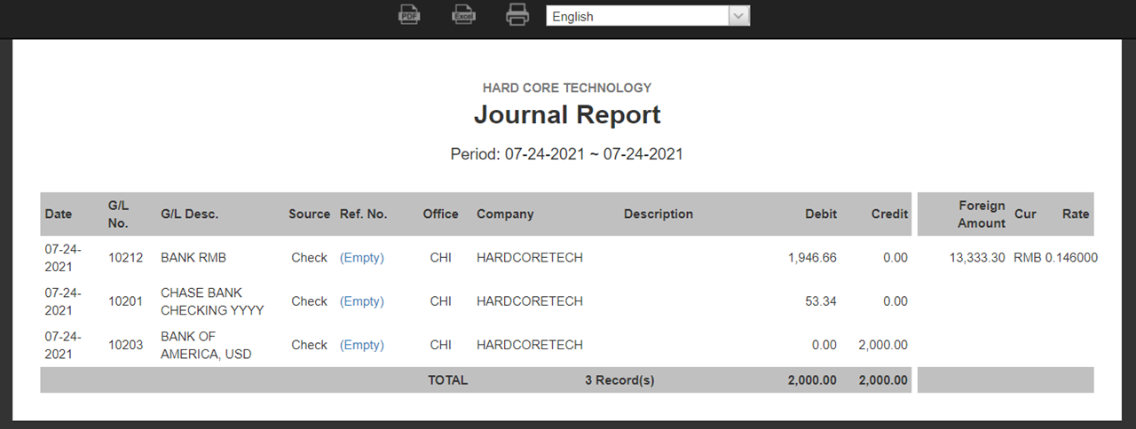 Example: If your main currency is USD and you need to transfer from "Bank USD" to "Bank RMB," transfer USD 2000.