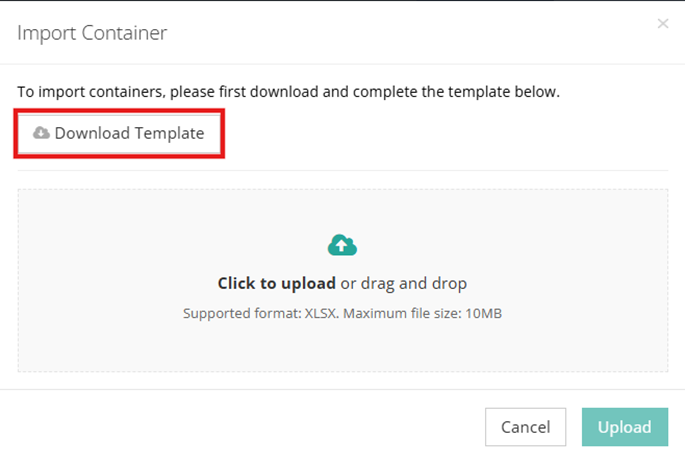- Hover over the Import Container button and select Download Template, or click on it to open the table of contents.