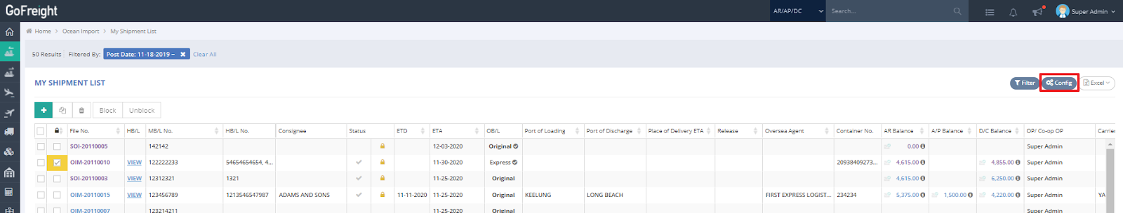 - Click on “Config” in the list view table.