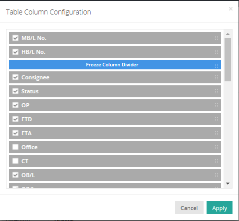 - Select the items you want to display by checking the corresponding boxes and uncheck any items you do not wish to see. If you drag an item above the “Freeze Column Divider,” all columns up to and including this item will be frozen in the pane.