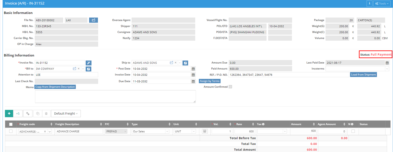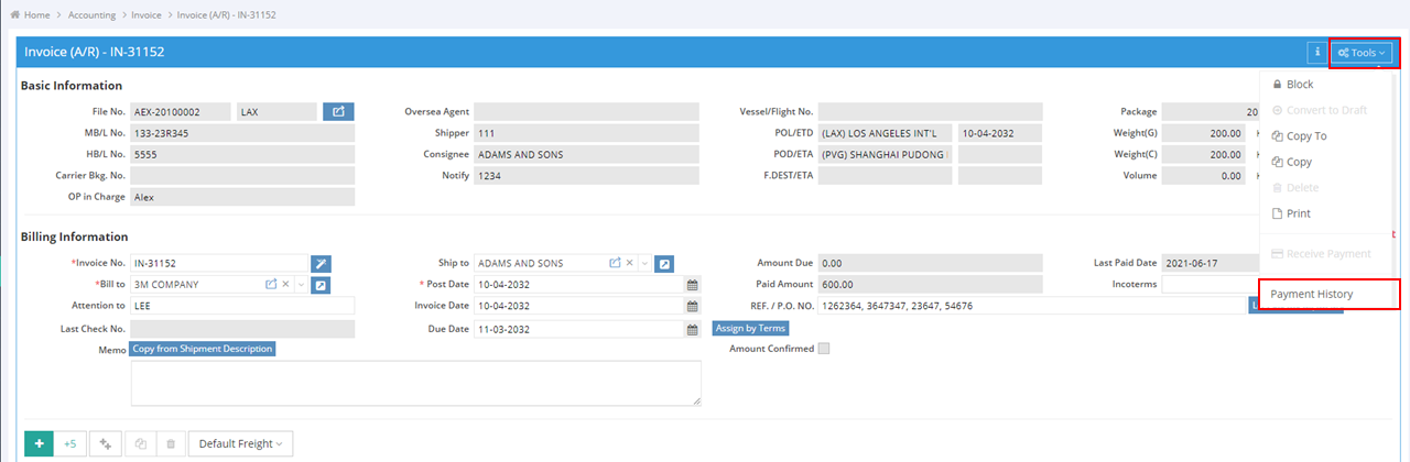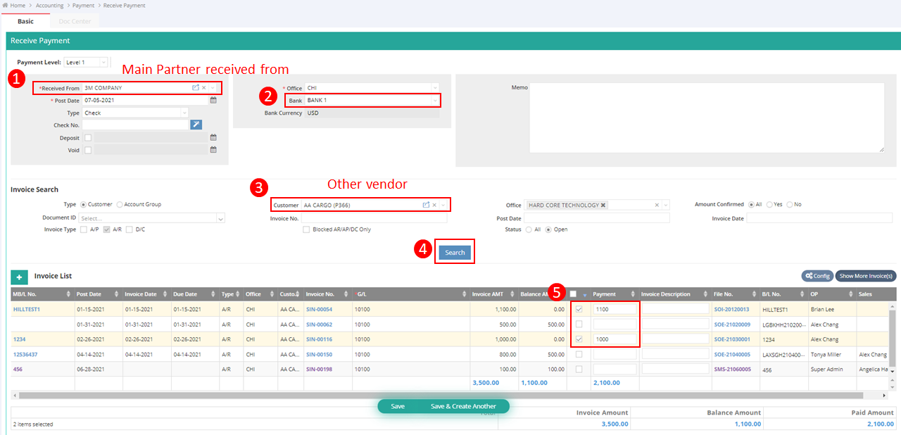The next time the customer pays the remaining balance, go to "Accounting" > "Payment" > "Receive Payment." Select the same company in "Receiving From" (e.g., "AA CARGO (P366)"), and click "Search" in the Invoice Search Bar to locate the invoice.
