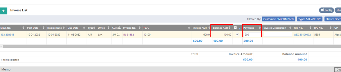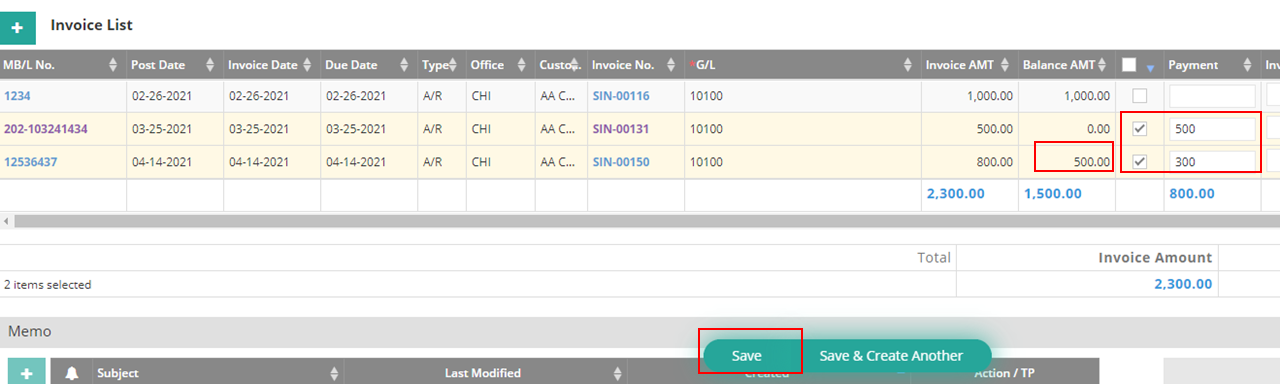 If the customer has made a partial payment, adjust the payment amount accordingly. For example, if the customer paid a total of $800, with $500 for SIN-00131 and $300 for SIN-00150, the remaining $500 balance for SIN-00150 will be displayed in the "Balance Amount".
