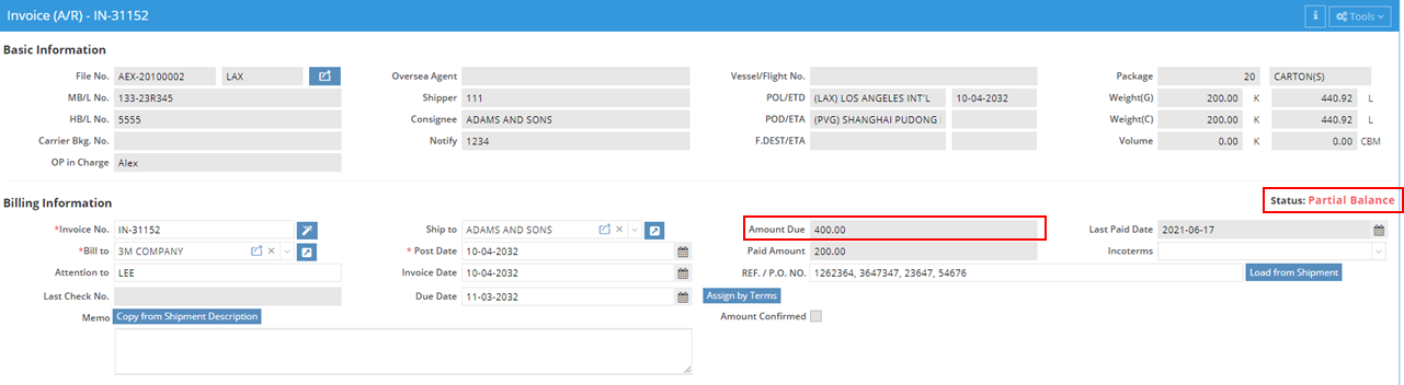 The invoice status will now be displayed as “Partial Balance”, and the remaining amount due can be viewed in the "Amount Due" column.