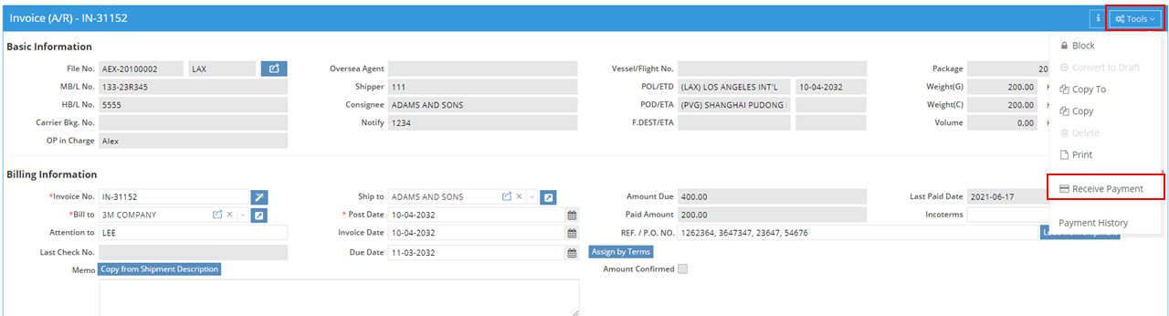 1. Go to the invoice entry page, click “Tools” > “Receive Payment.”