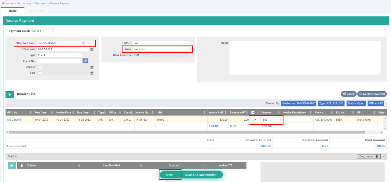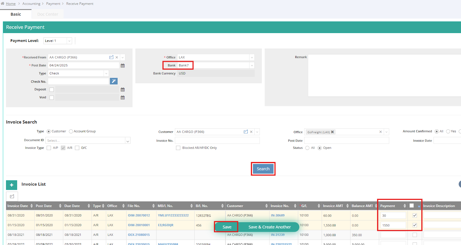 3. Verify the invoice and complete the amount in the "Payment" field, then select the received “Bank.” Click "Save."