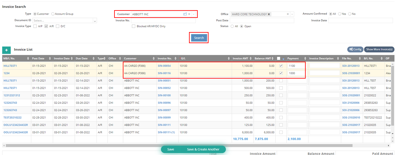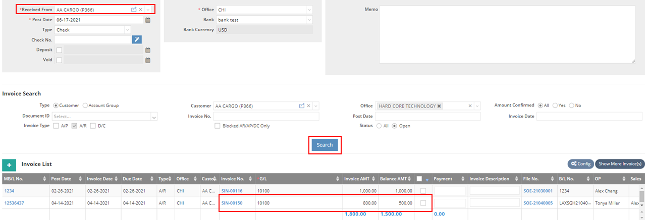 3. Once you enter the “Received From” field, the Invoice Search section will display below. Select another vendor in “Customer.” In this example, we are using “AA CARGO (P366).”