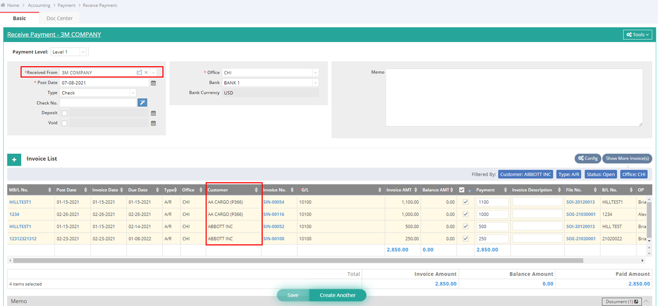 Then, this payment will include invoices for both customers, “ABBOTT INC” and “AA CARGO (P366)”, and you will receive the payment from “3M COMPANY.”