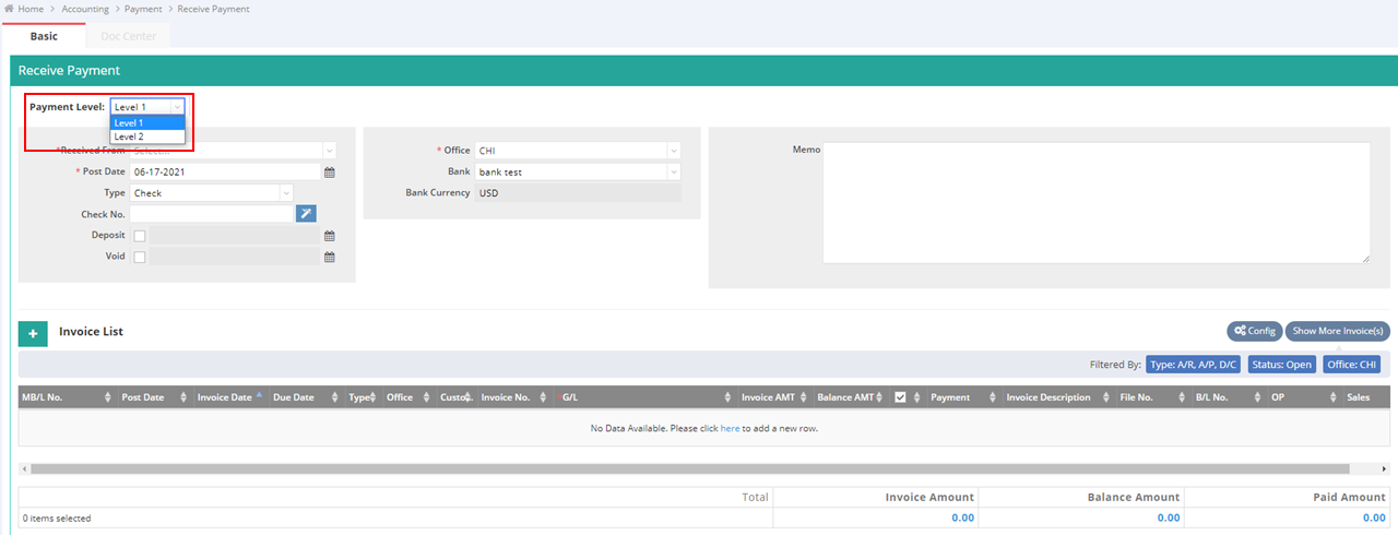 Then, choose “Payment Level” to classify the payment. Payment set up with Level 2 can only be viewed by the Accounting Manager and General Manager.