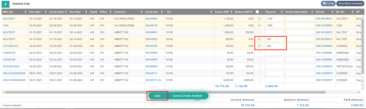 6. Next, choose another customer, “ABBOTT INC,” and click "Search." The invoices will be displayed in the list below. Note: The invoices previously selected for the customer “AA CARGO (P366)” will remain visible in the list.