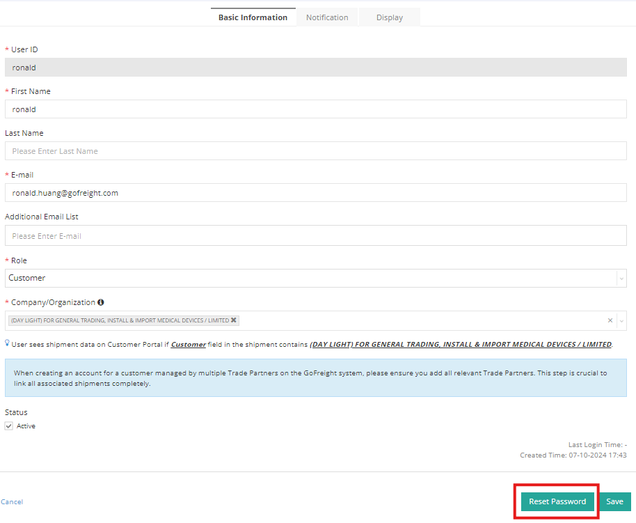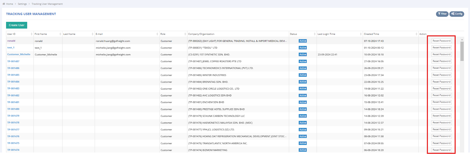 - Click "Reset Password" in the "Action" column (only for active users