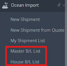 1. Navigate to Ocean Import >Master B/L List (Master Bill of Lading List) or House B/L List (House Bill of Lading List).