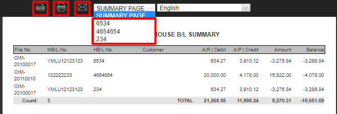 4. To review the profit for specific shipments, simply click the corresponding dropdown menu at the top of the Summary Page to select the shipment. You can also choose to download a PDF, Print a PDF, or email the report, depending on your needs.