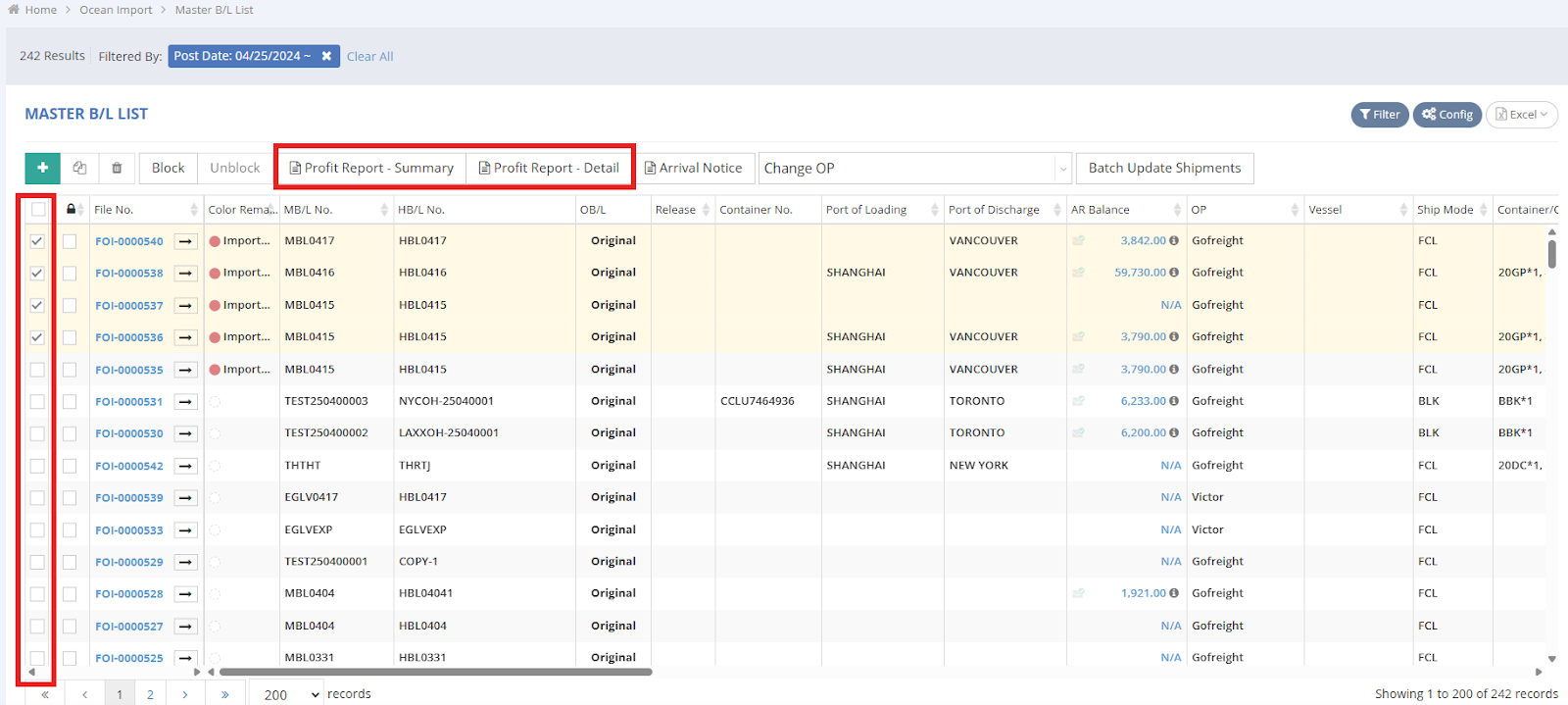 2. Under the Master Bill of Lading List, select the shipments you want to review by checking the boxes, then click either “Profit Report - Summary” or “Profit Report - Detail” located above the list.