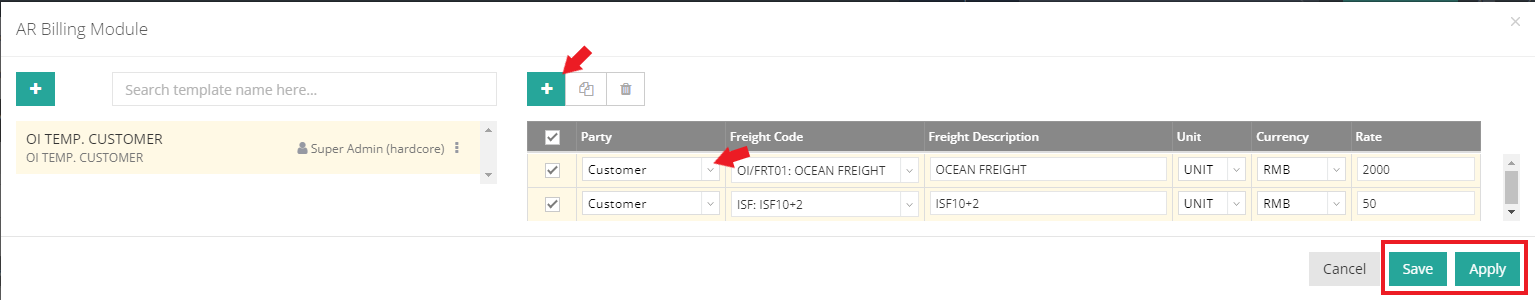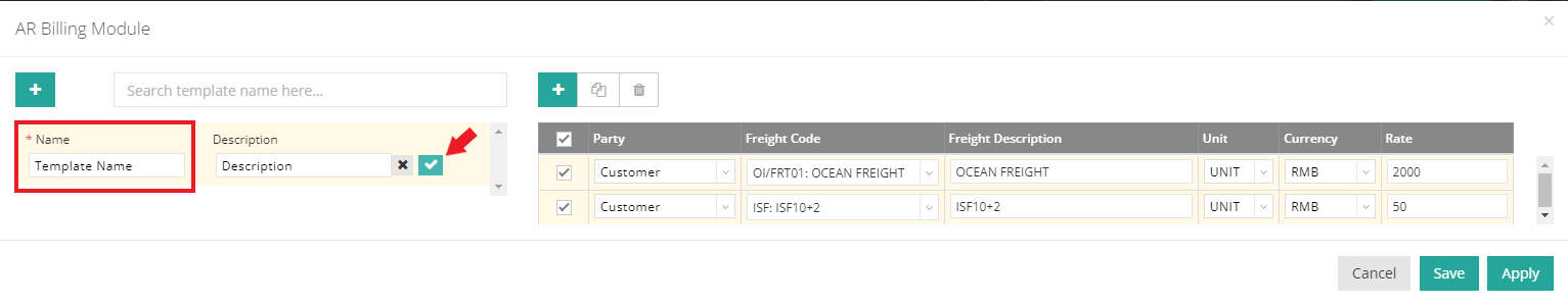 Before you Save or Apply your template, you still can modify the template details, e.g. creating a new billing item, selecting other party types, and etc..