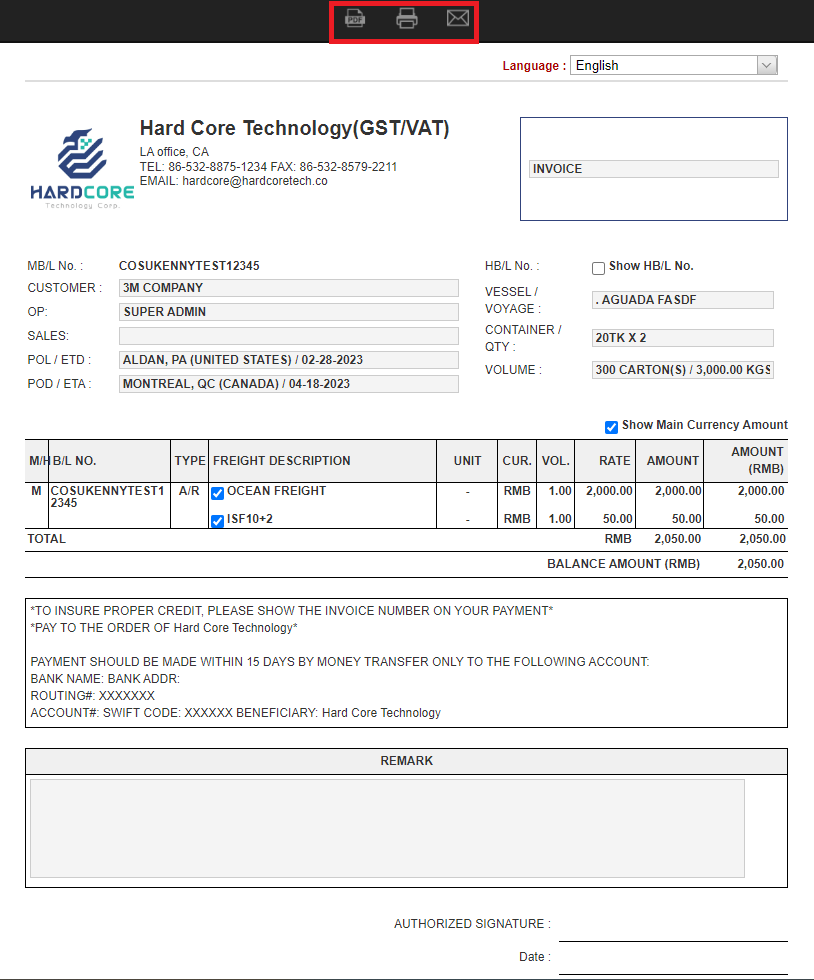 On this printing preview page, you are able to click on the three buttons on the top of the page to download, to print out, or to email this invoice.