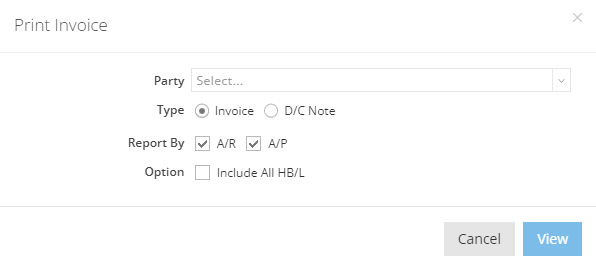 On this "Print Invoice”, select your invoice party, type, Report By, and Option. Then click on “View”.