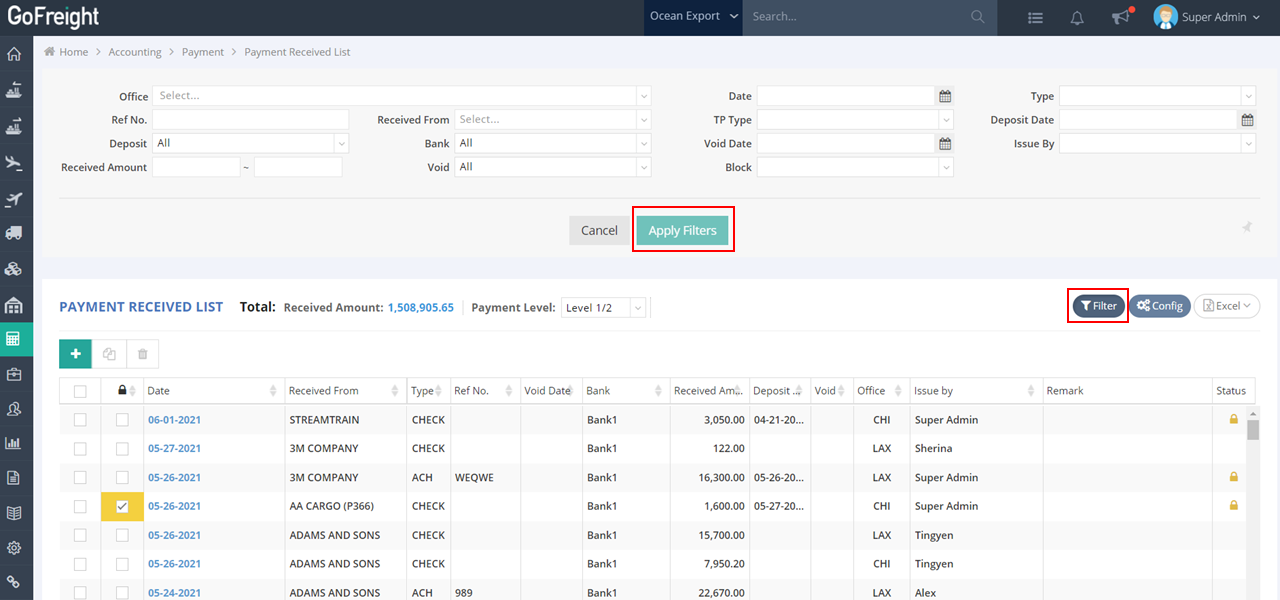 - Click on Filter. You can search for payments by entering or selecting the following criteria: Received From, Reference Number, and Bank, for example.