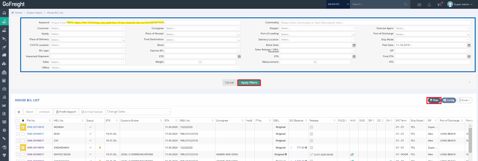 - Click “Apply Filters” to retrieve the desired HB/L shipment.