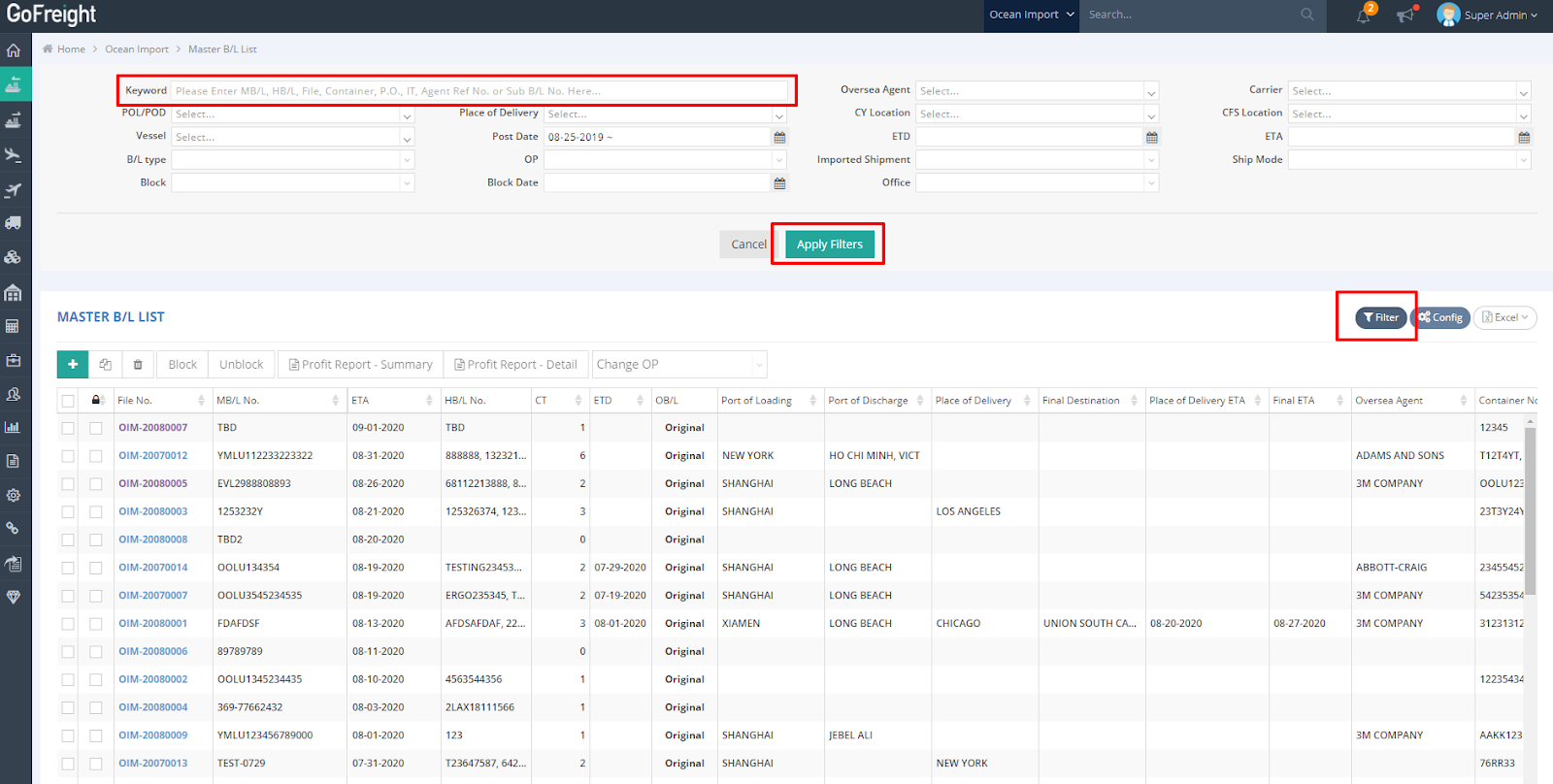 Navigate to the Master B/L List (Master Bill of Lading List) in either the Ocean Export or Ocean Import module, and then click on 'Filter.' You can search for the Master B/L you need by entering one of the following in the Keyword field: