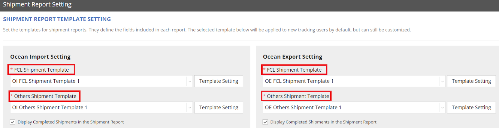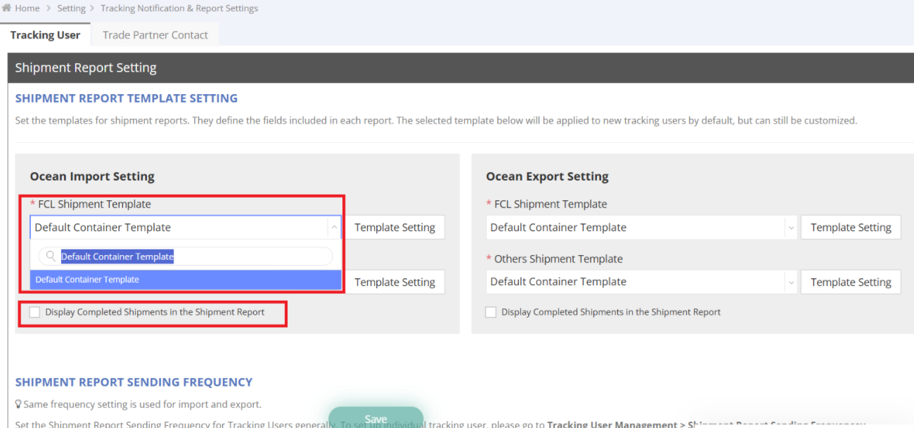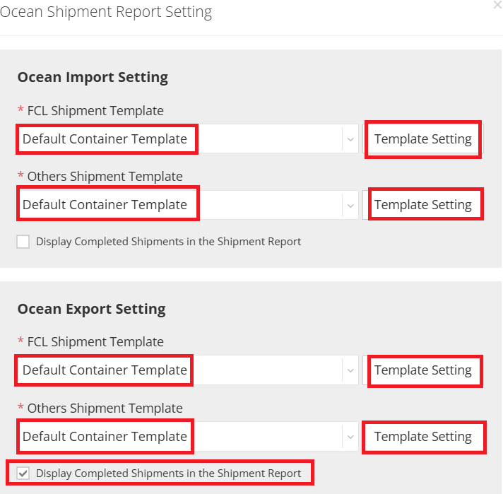 - For each shipment type (FCL / Others), select the appropriate template from the dropdown menu. (The default shown is the one you configured in Step 1.)