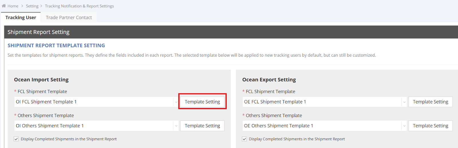 *** Important: Templates configured on this page will become the default template for all newly created Tracking Users.