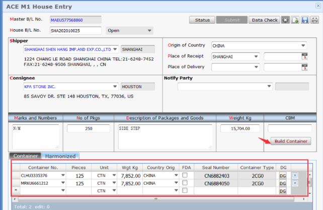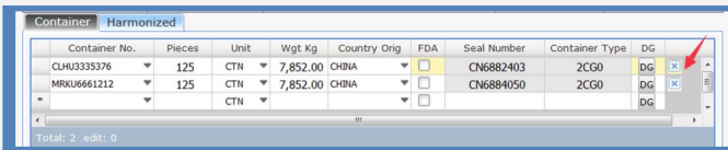 ❖ You can modify details such as the shipper, consignee, number of pieces, gross weight, product name, mark, packing unit, and delete redundant container information.