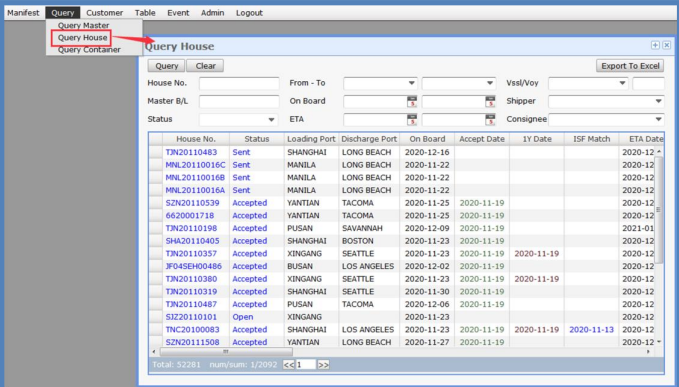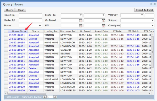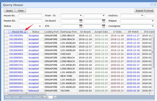 ▪ Click the “Export To Excel” button to export all data shown under the Query House interface to an Excel sheet.