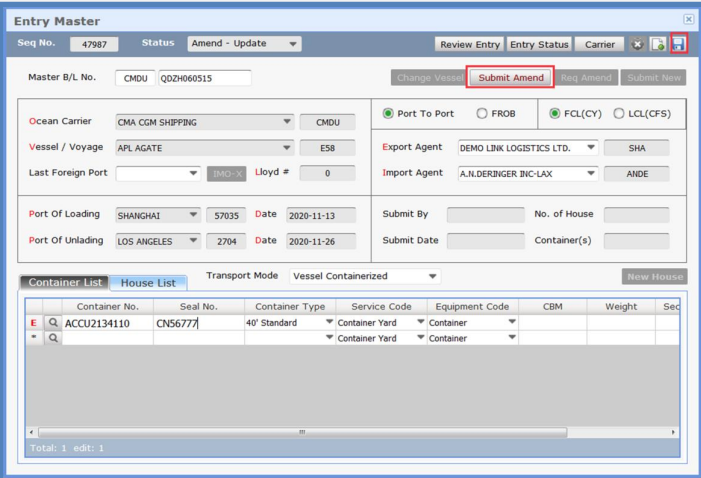 ❖ You can modify the master bill number, container number, seal number, container type, and import/transit goods.