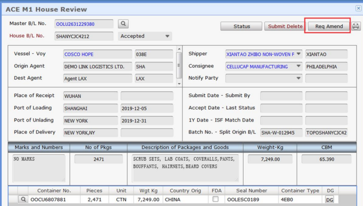 ❖ Note: If there are multiple house bills under the master bill, clicking the "Submit Amend" button will send each house bill to customs separately for modification.