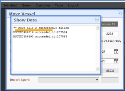 ❖ The system will indicate that the "Move Vessel" operation was successful and the new bill has been sent to customs. After 5 minutes, check the customs response message.