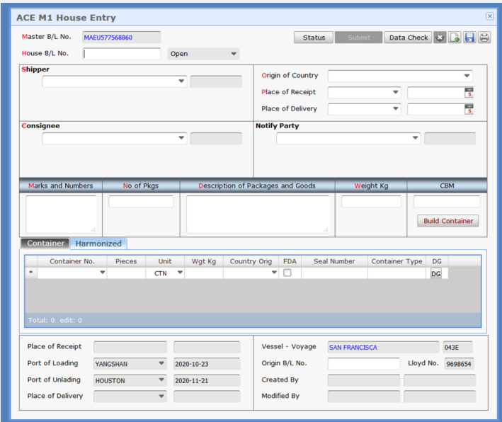 ❖ After saving the MBL Interface, click the New House button to open the House bill interface.