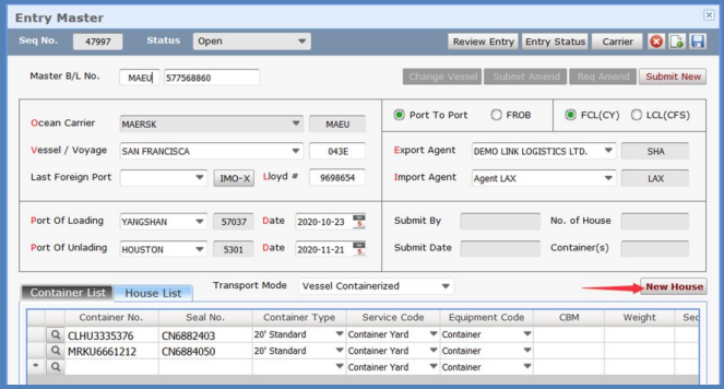 ❖ The new HBL will be added under "New House" in the original MBL interface. If the MBL number is different, reprocessing is required.