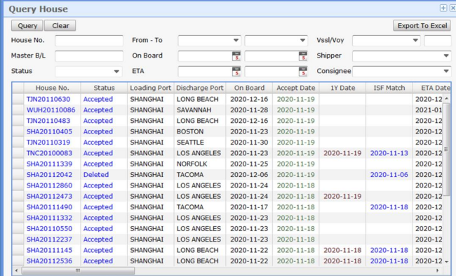 ❖ To search for House B/L with Loading Port as Shanghai and status as Rejected: