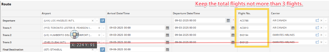 Note: In case a shipment contains more than four transshipment flights to the destination, please remove one flight so that the total route does not exceed three flights before submitting eAWB, as required by the vendor, Champ.