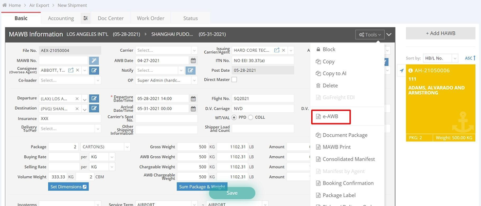Step 2: Click “Tools” under the MAWB section and select “e-AWB”.