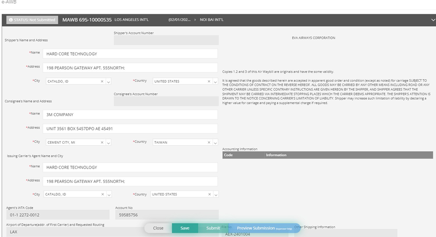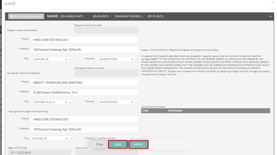 Step 3: A pop-up window will display the information you entered. Ensure all required information marked with red asterisks is filled out correctly (e.g., City, State, and Country of shipper and consignee). Note:Tthe city name must be entered using by UN/LOCODE.