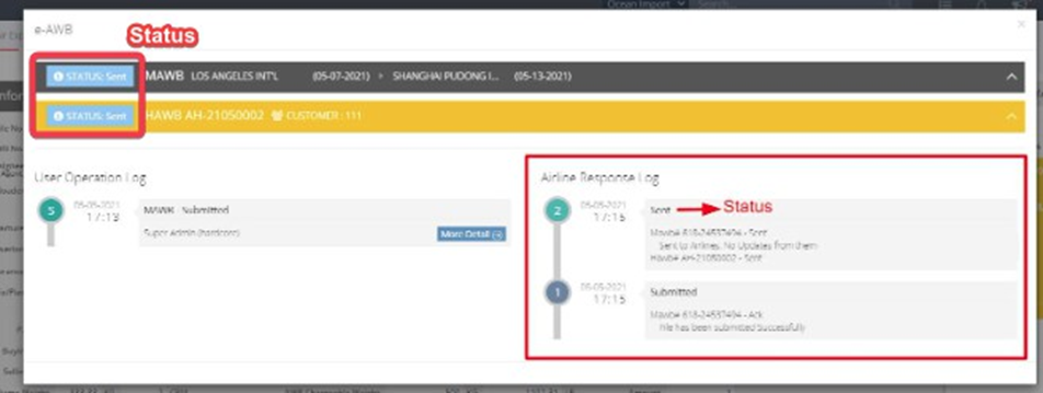 Step 5: After submission, check the status details at the bottom. The upper left corner of each e-AWB will also display its status.