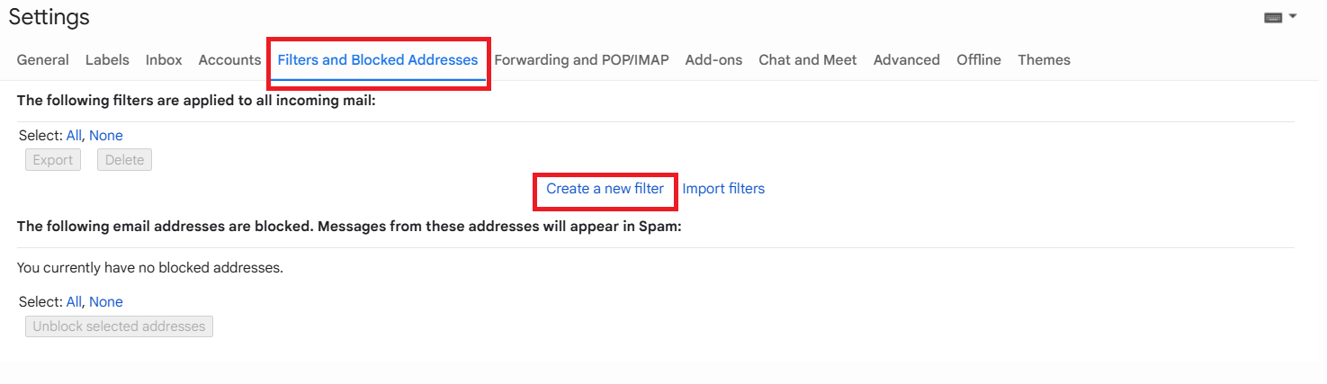 2. Navigate to Filters and Blocked Addresses and click Create a new filter.