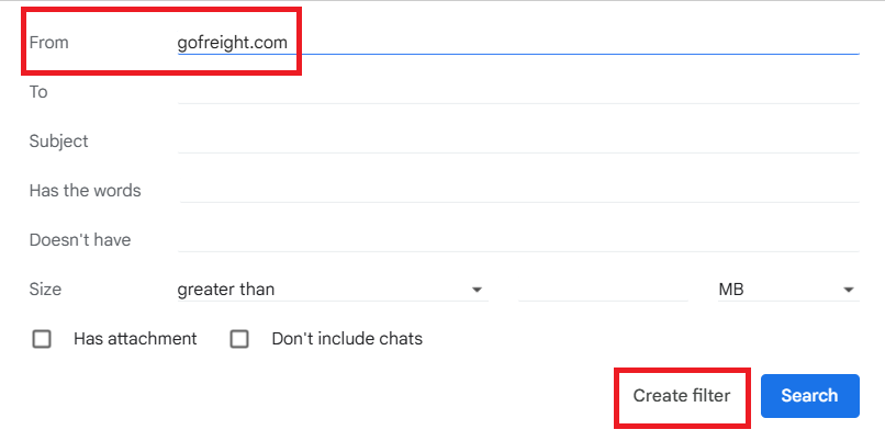 3. In the From field, enter gofreight.com, then click Create filter.