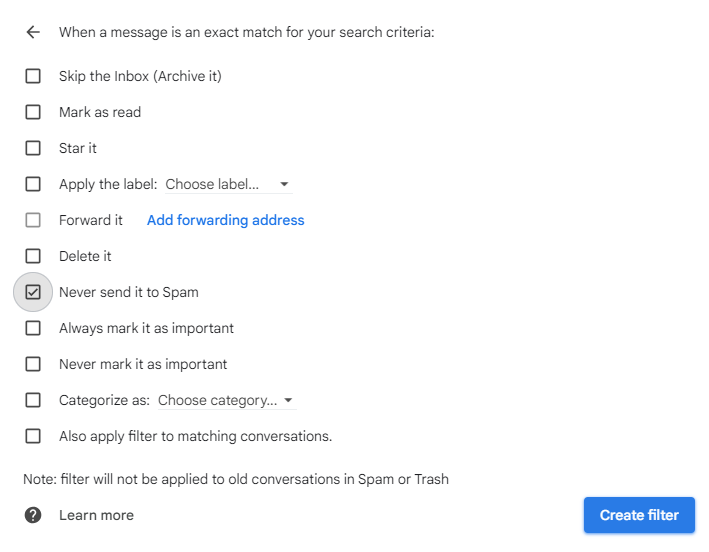 4. Check the box that says Never send it to Spam, then click the Create filter.