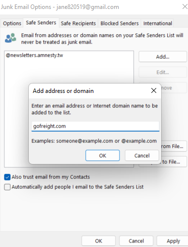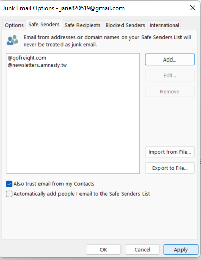 3. In the Junk Email Options section, navigate to Safe Senders, and click Add.