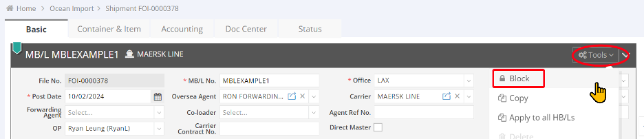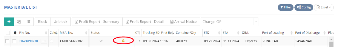 3) If you check the box under the black lock icon in the MBL List or select Block under Tools on the MBL page, that MBL and all its associated HBLs will be locked.