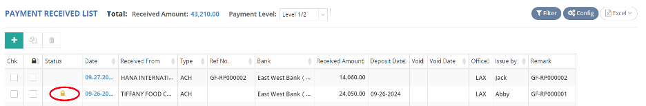 3) Payment Received/Made List: If the Status column shows a yellow lock, it signifies that a Deposit or Clear action has been performed. To delete the payment, the Deposit/Clear action for that payment must be canceled first.