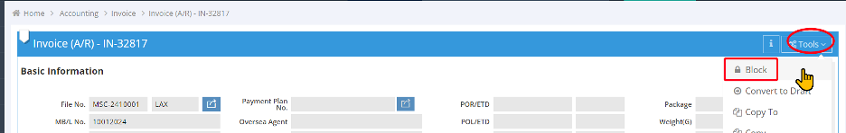 2) Users with appropriate permissions can lock (block) or unlock (unblock) a shipment, invoice, or payment by checking or unchecking the box below the black lock icon. Alternatively, this action can be performed from the Tools > Block/Unblock menu within the specific shipment, invoice, or payment page. (When locking/unlocking is done through the Tools menu, the checkbox below the black lock icon will automatically reflect the change.)